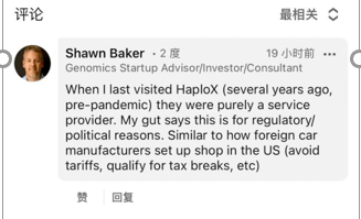 在海普洛斯和因美纳发布该基因测序系统后,基因组学顾问、因美纳的前科学家ShawnBaker在个人社交媒体质疑:“几年前他去海普洛斯参观时,发现这是一家纯粹的服务商,直觉告诉他,这样宣传可能是为了规避某种政策,类似于外国汽车制造商在美国设立工厂能享受税收优惠一样。”