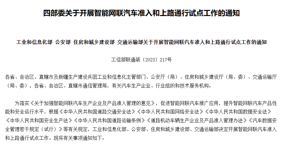11月17日,工业和信息化部、公安部、住房和城乡建设部、交通运输部等四部门近日联合印发《关于开展智能网联汽车准入和上路通行试点工作的通知》(以下简称《通知》),具备量产条件的L3、L4级别智能网联车在限定区域内可以开展上路通行试点。