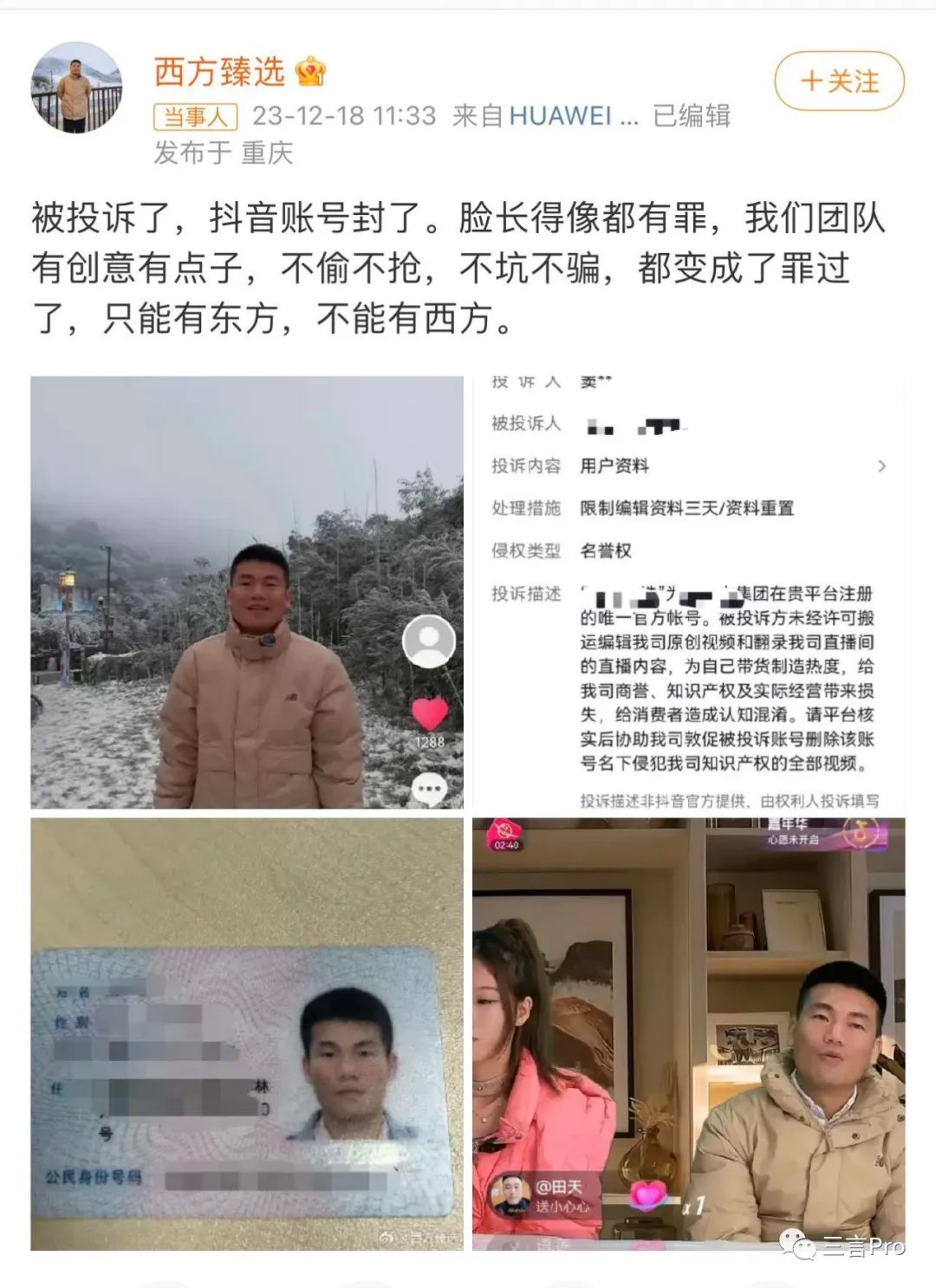 西方臻选在微博表示:被投诉了,抖音账号封了。脸长得像都有罪,我们团队有创意有点子,不偷不抢,不坑不骗,都变成了罪过了,只能有东方,不能有西方。
