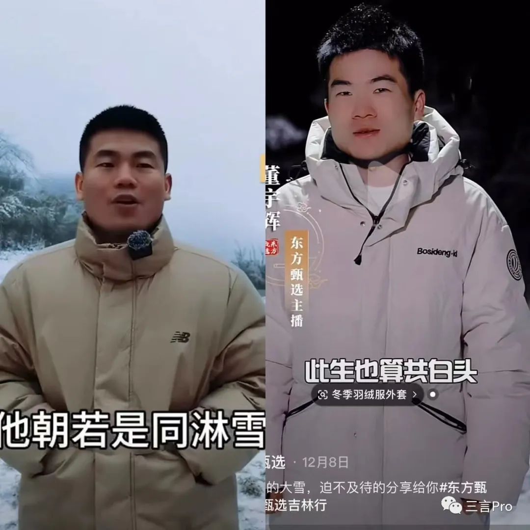 拿雪地的视频来看,西方臻选主播站在雪地念了那句"他朝若是同淋雪,此生也算共白头"。而董宇辉也有这段视频。