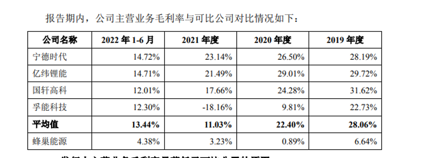蜂巢能源亏损如此严重,主要原因在于其毛利率也偏低。在《关于蜂巢能源科技股份有限公司首次公开发行股票并在科创板上市申请文件的审核问询函》回复函中显示,2020年到2022版半年期间,蜂巢能源的毛利率分别为0.89%、3.23%和4.38%。