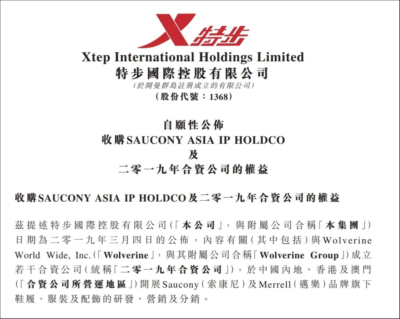 2019年初,特步国际直接全资附属公司Xtep Holdco与Wolverine全资附属公司Gemini Operations B.V.签订协议成立合资公司,双方各出资1.55亿元分别持股50%,在中国内地、香港及澳门开展索康尼及迈乐品牌旗下鞋履、服装及配饰的开发、营销及分销。