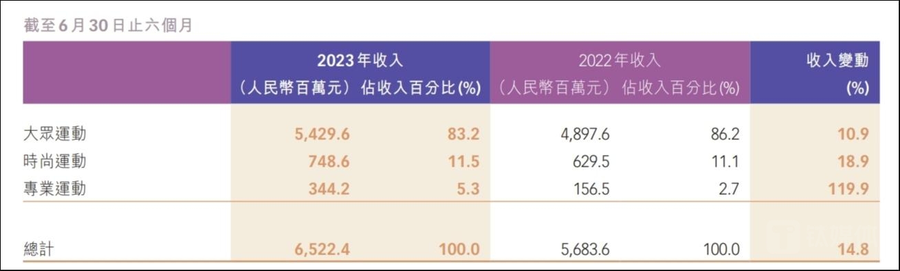 据特步国际最新公布的2023年中期业绩报告显示,截至今年上半年,公司共实现营收约65.22亿元,同比增长14.8%。其中,大众运动(即主品牌)实现营收约54.3亿元,同比增长10.9%,占总营收的比例达83.2%;时尚运动(即盖世威、帕拉丁)实现营收约7.49亿元,同比增长18.9%;专业运动(即索康尼、迈乐)实现营收约3.44亿元,同比增长119.9%。