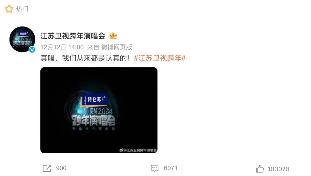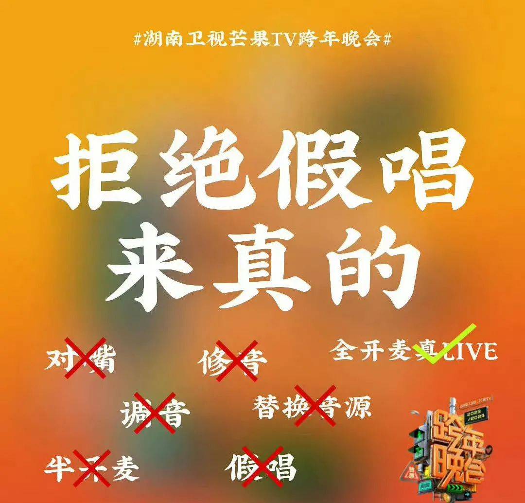 无独有偶,江苏跨晚亮明态度后,一张疑似湖南跨晚“拒绝假唱来真的”宣传图就在微博广为流传,图片上更标明了“全开麦真LIVE”、“反对对嘴”、“反对修音”等字样。尽管该宣传图真实性存疑,就目前舆论场反响来看,这晚会不真唱很难说得过去了。