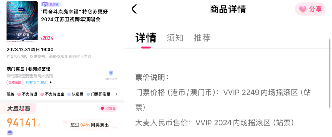 相比湖南卫视,江苏卫视售票的“玩法”更花。由于荔枝台跨晚遵照传统在澳门银河综艺馆开办,因场地要求,该晚会只发售内场摇滚区VVIP“站票”,票价为2024元人民币(澳门币2249元)。尽管票价偏高,但内场摇滚确实是不一般体验,这个讨好彩头的2024元定价还算合理。