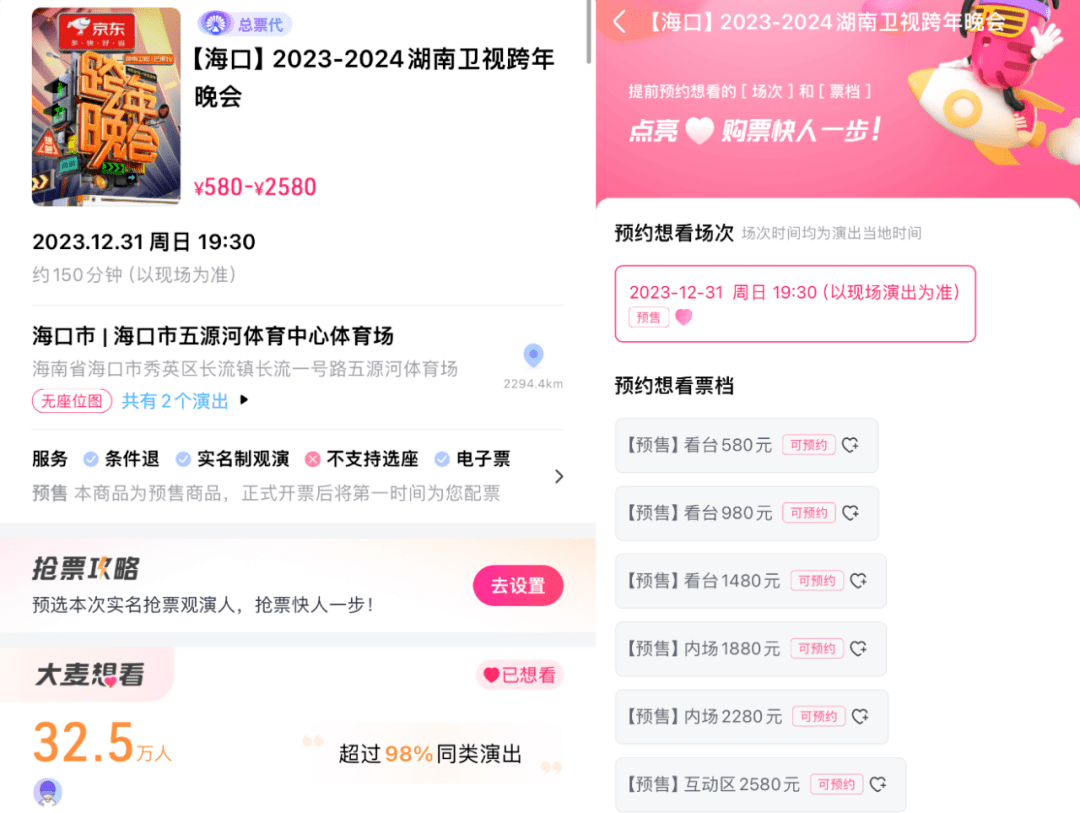 12月12日,湖南跨晚率先在大麦上“放票”,据大麦APP数据显示,目前该晚会大麦想看人数已到达32.7万人,预售票价从看台票580元到互动区票2580元不等,此价格已经赶上周杰伦演唱会票价分档。而且,该晚会12日第一轮抢票已经售罄,19日还会开放第二轮预售,如此来看,估计该晚会“票房”收入会相当可观。