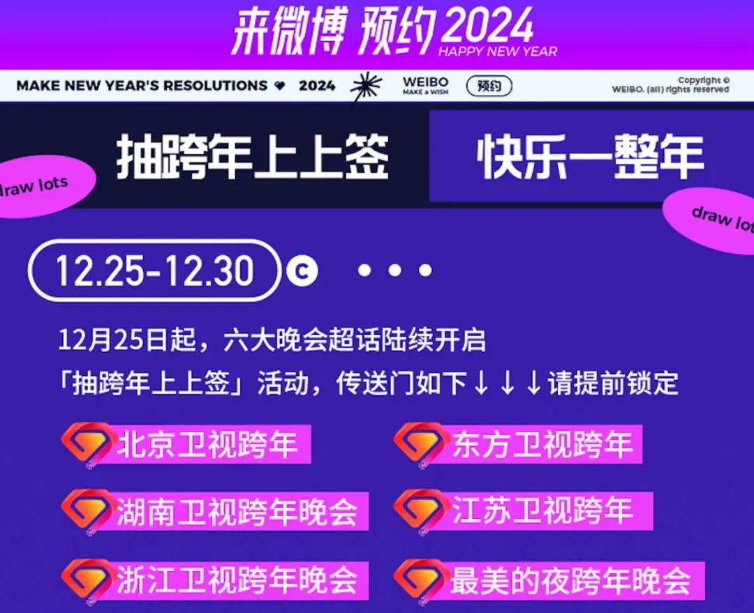 想必是深知今年跨晚流量之丰,最近连微博都悉心策划了一个“2024微博跨年狂欢节”活动,借流量明星话题造势的同时,还宣布从25日起陆续给六大跨晚开“超话”。内娱年底最壕流量盛宴将至,各位想好观看姿态了吗?