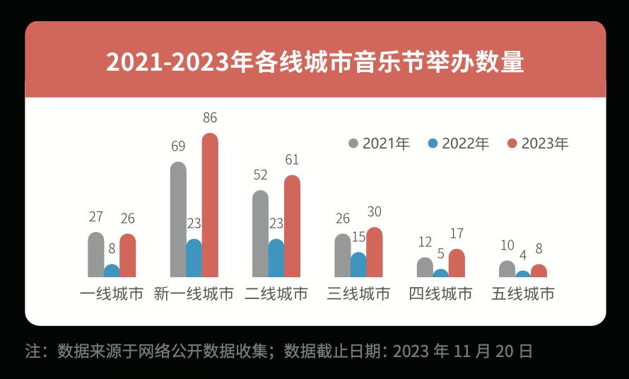 《白皮书》显示,2023年一线城市举办音乐节数量26个,其他分线城市举办音乐节数量明显上涨,其中新一线城市全年举办音乐节的数量为86个,是一线城市的三倍之多;二线城市则为61个,也超过一线城市的两倍。