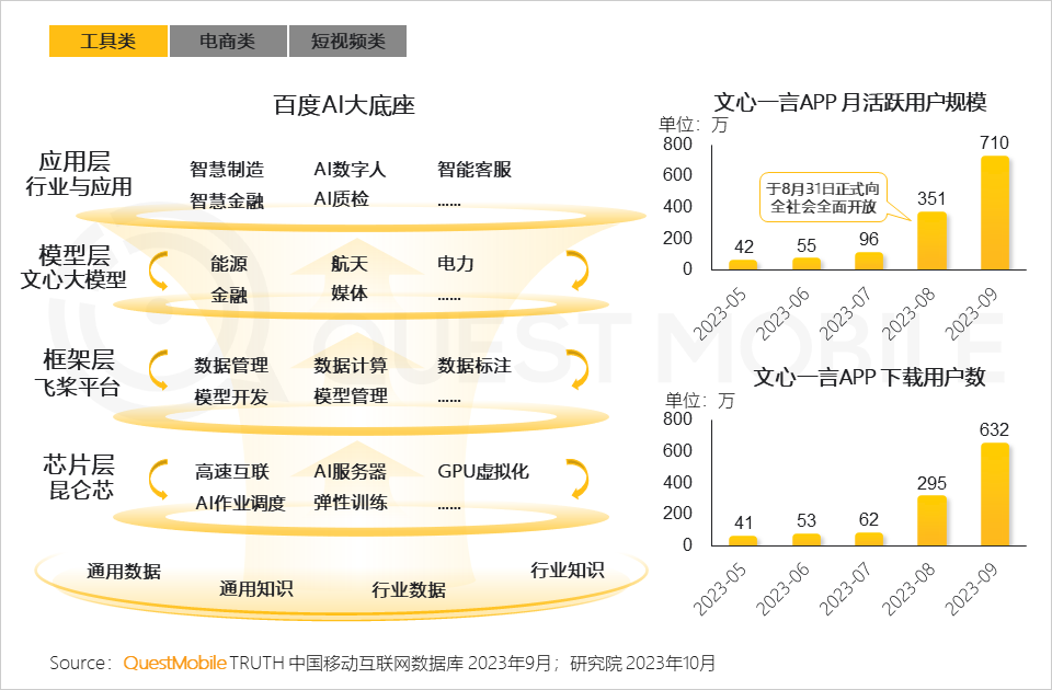 2.2 文心一言依托百度AI大底座,自2023年8月开放全民下载后,成为百度旗下新的工具类应用流量入口