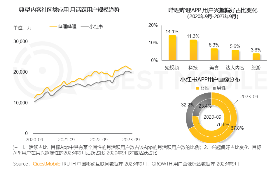 QuestMobile数据显示,近三年以来,哔哩哔哩APP用户在短视频、科技及美食等领域兴趣领域活跃占比增长最为显著;小红书APP男性用户占比已达32.2%,较2020年9月提升8.8%。