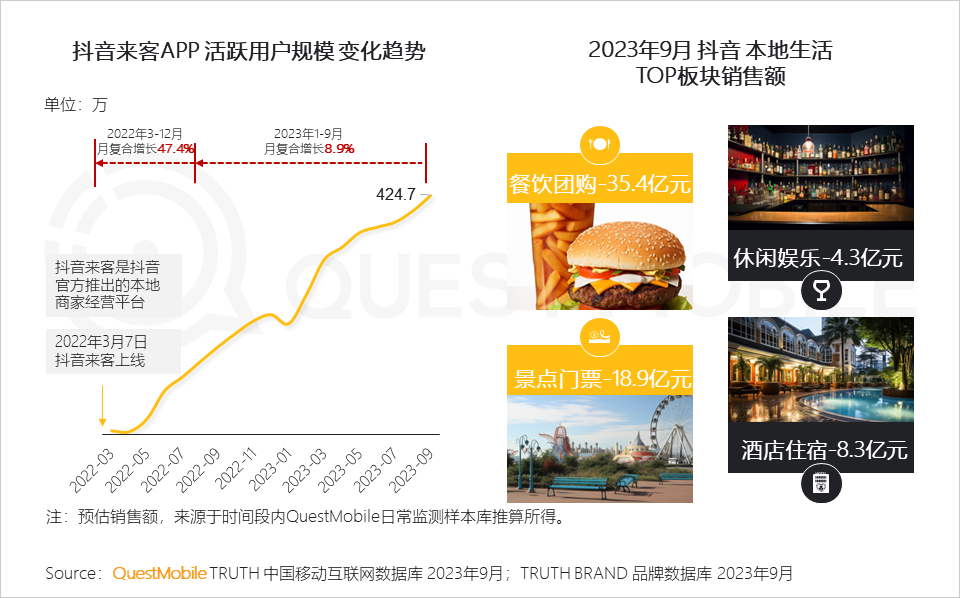 QuestMobile数据显示,2023年9月,抖音本地生活板块,餐饮团购、景点门票销售额破10亿元。