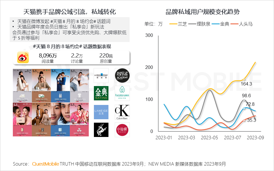参与天猫“私享会”活动的品牌如兰芝、理肤泉、金典等在活动当月私域用户规模明显出现波峰。