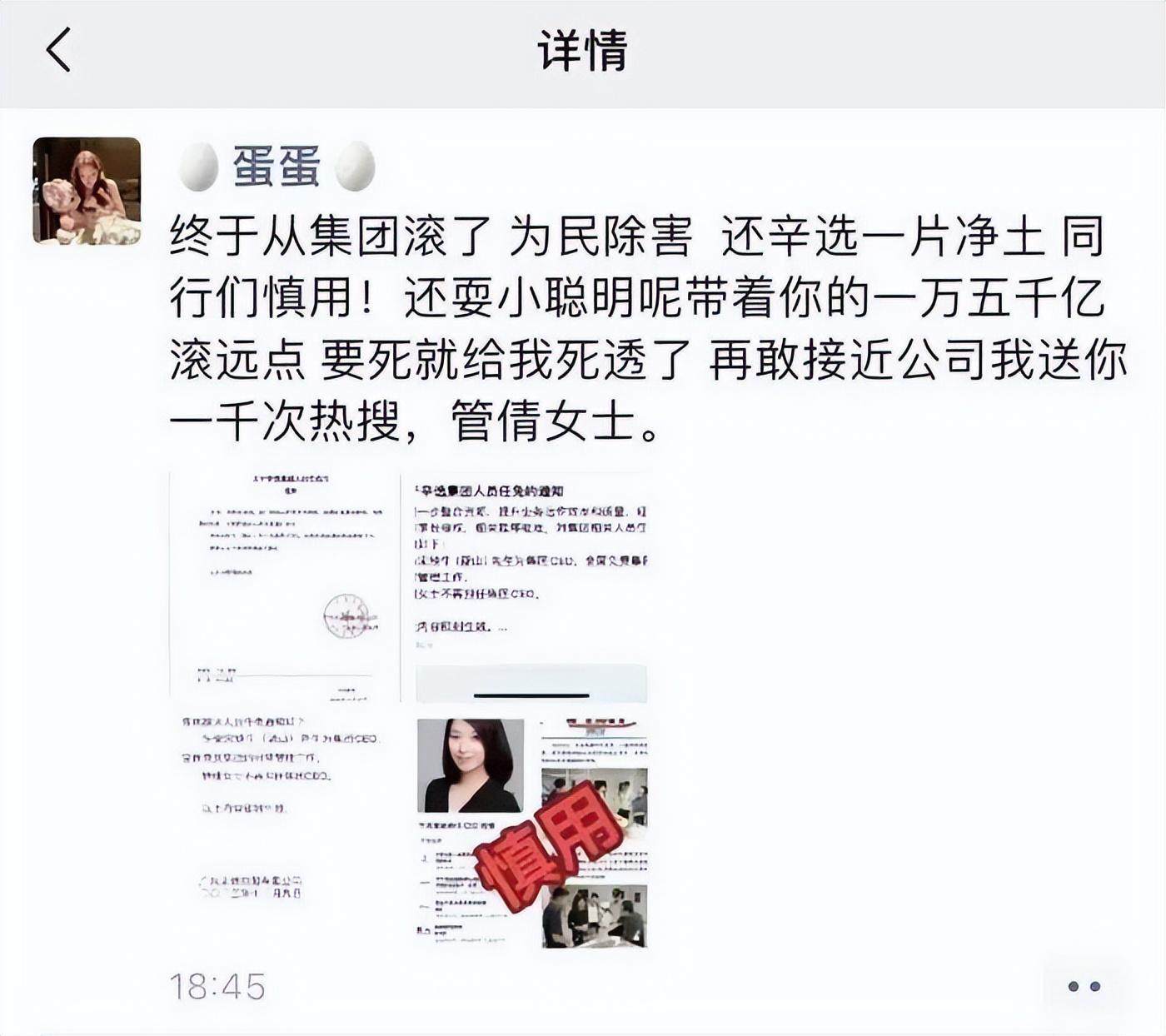 这也被视作蛋蛋“逼宫”成功的信号,网传截图显示,蛋蛋对此事直言:“终于从集团滚了,为民除害,还辛选一片净土。”蛋蛋之所以敢这么硬刚CEO,背后还是她作为辛选乃至快手一姐的底气。