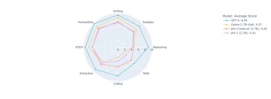 11月中旬,微软研究院机器学习团队的负责人Sebastien Bubeck在推特上发布了一张图,显示了在MT bench的测评体系下,仅有27亿参数规模的Phi-2得分6.62,18000亿参数的GPT4得分8.99。