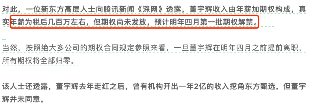 该报道显示,董宇辉的真实税后年薪只有几百万,其中第一批期权激励要到明年4月才能解禁,截至发稿前,东方甄选未否认该信息的真实性。