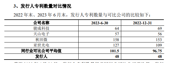 其次,晶讯光电在申报稿披露同行可比公司分别为骏成科技、天山电子、秋田微、亚世光电,其专利情况如下: