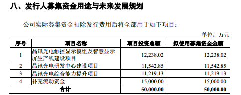 从募投项目上看,晶讯光电此次欲募集5亿元分别用于晶讯光电触控显示模组及智慧显示屏生产线建设项目、晶讯光电研发中心建设项目、晶讯光电综合能力提升项目、补充流动资金,具体情况如下: