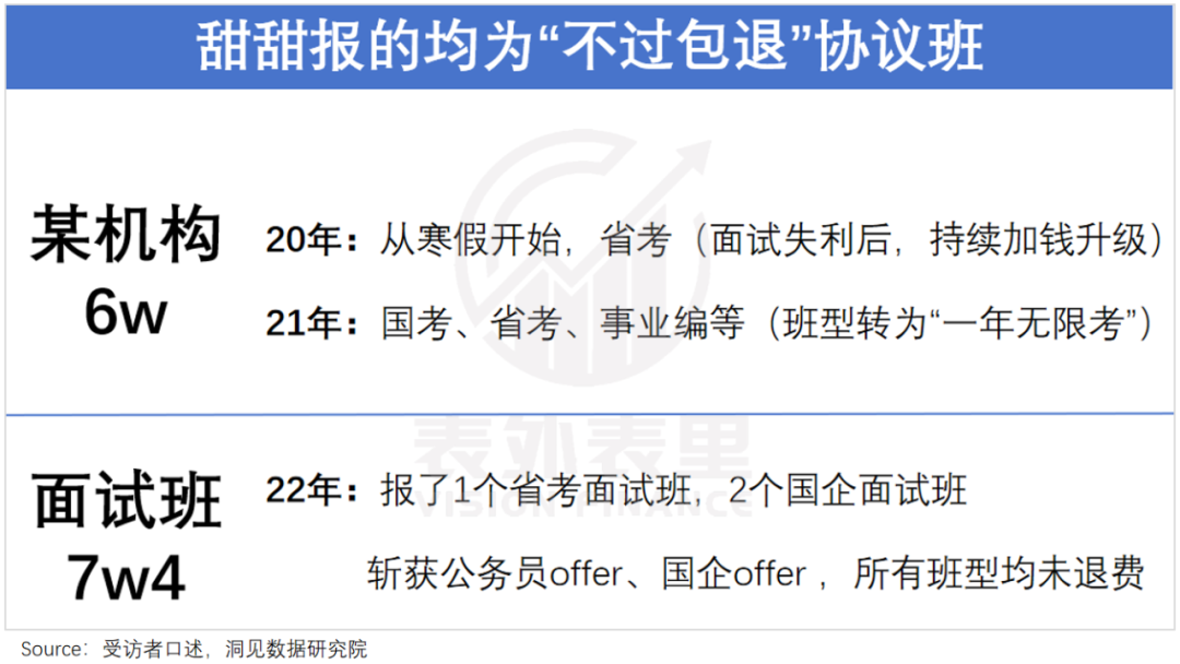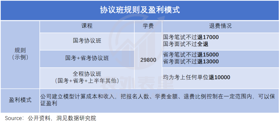 不过,这些都是不入流的小手段,若论公考培训行业里的“创举”,非“协议班”莫属——考生若在考试中不能通过,可以差额甚至全额退款,相当于一份对赌协议。