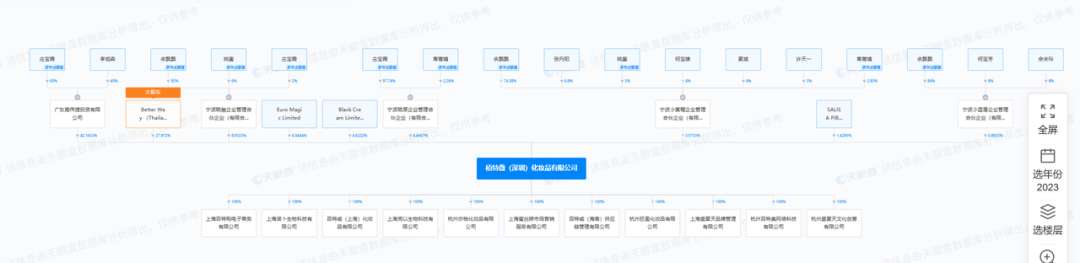 天眼查显示,蜜丝婷在中国的运营主体栢特薇(深圳)化妆品有限公司的实际控制人为广东嘉伟捷投资有限公司,持股42.17%,第二大股东才是泰国蜜丝婷品牌母公司Better Way (Thailand) Co.Ltd,持股27.87%。