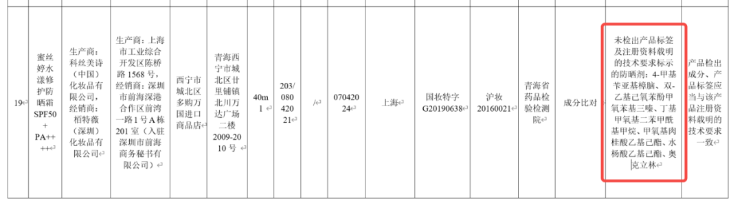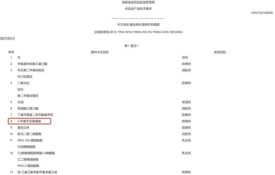 以通报中显示未检出的4-甲基苄亚基樟脑防晒剂为例,在国家药监局公示的该款产品的配方成分中,该防晒剂在产品共计32个成分中为例第8位。