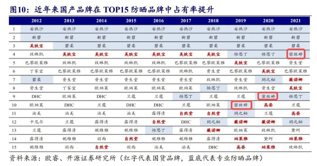 2019年,进入中国两年多的蜜丝婷首次进入防晒霜top15榜单,并在2020年至2022年快速上升至第9位、第4位、第2位。