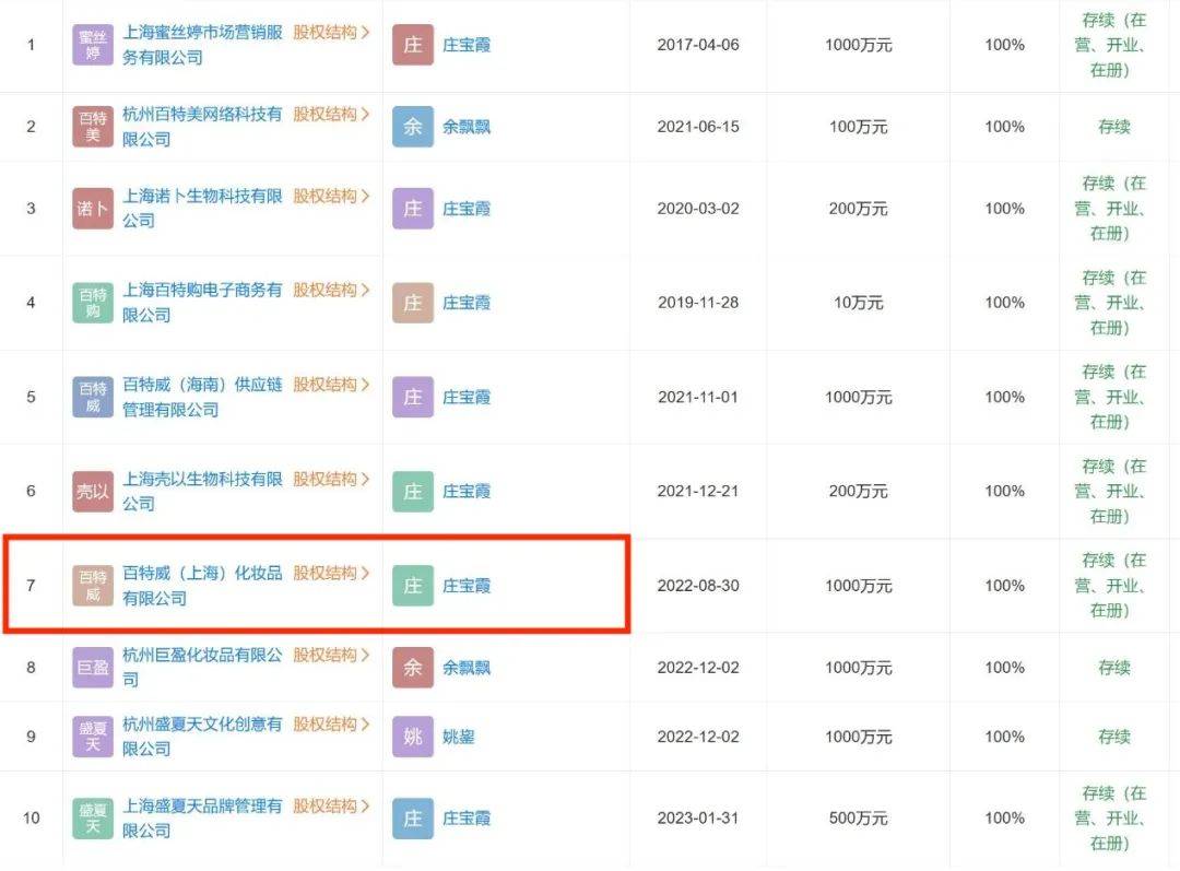 天眼查显示,蜜丝婷中国运营主体栢特薇(深圳)化妆品有限公司,对外投资公司共11家,绝大部分为经销、营销、研发等相关公司。