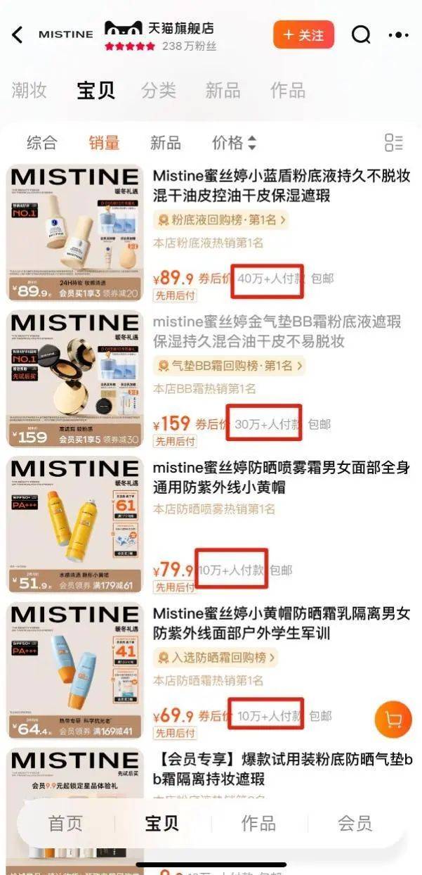 而从蜜丝婷天猫旗舰店数据来看,其彩妆的销量已经远超防晒霜,其中小蓝盾粉底和金气垫销量分别为40万+和30万+,小黄帽防晒霜和防晒喷雾的销量均为10万+。