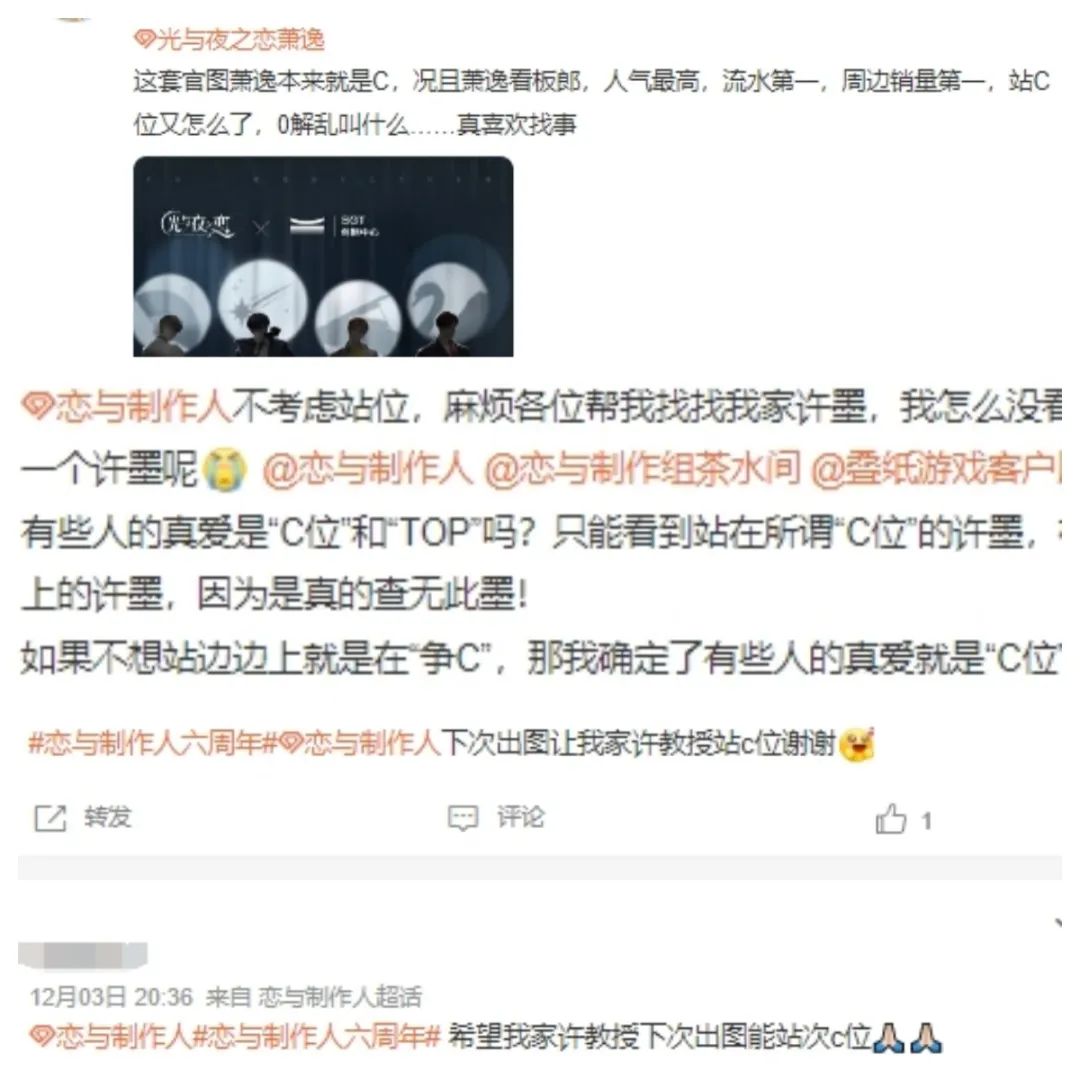 比如此前《光与夜之恋》和上海大剧院创制中心联动,发布了一张男主角海报,而粉丝却因为站位吵了起来,粉丝不满意自己喜欢的角色站在边角,要求站在正中间的C位,由此展开了一场骂战。