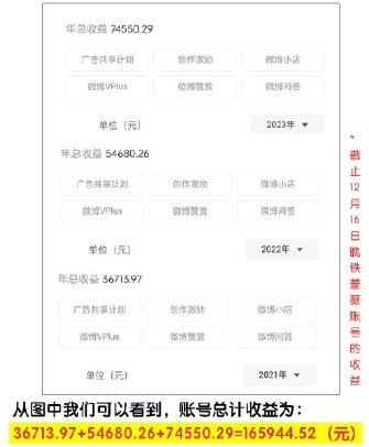 比如开通微博共享计划赚取收益,根据组员放出的后台数据可以看到,目前账号总收益超过了16万元,且已经被铁蔷薇组长提取到个人账户。