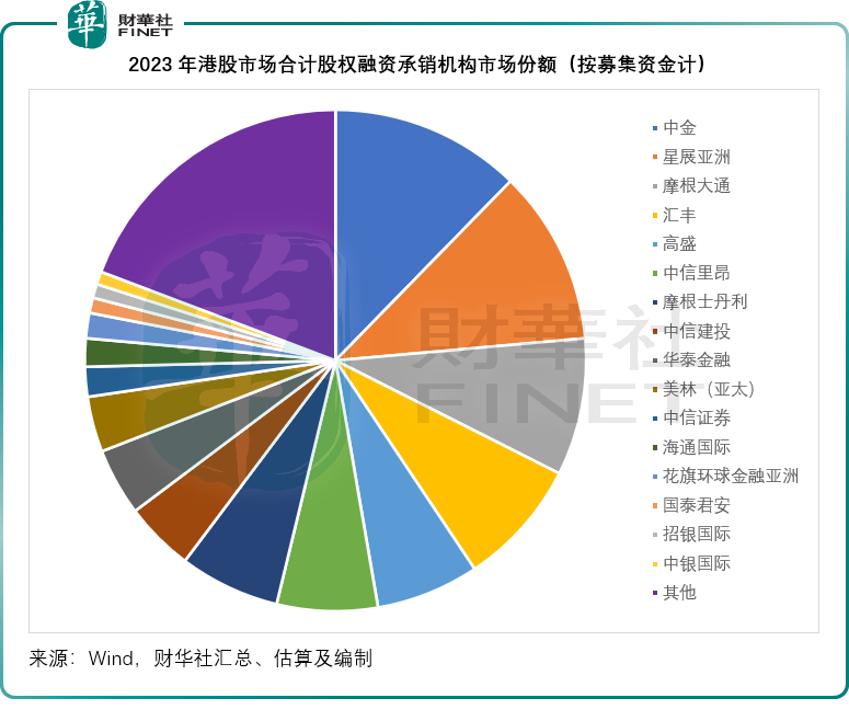 Wind的数据显示,今年合计股权融资承销机构市场份额占据榜首的是中金,按募资金额计算,中金的承销规模达到93.22亿港元,市场份额为12.31%;
