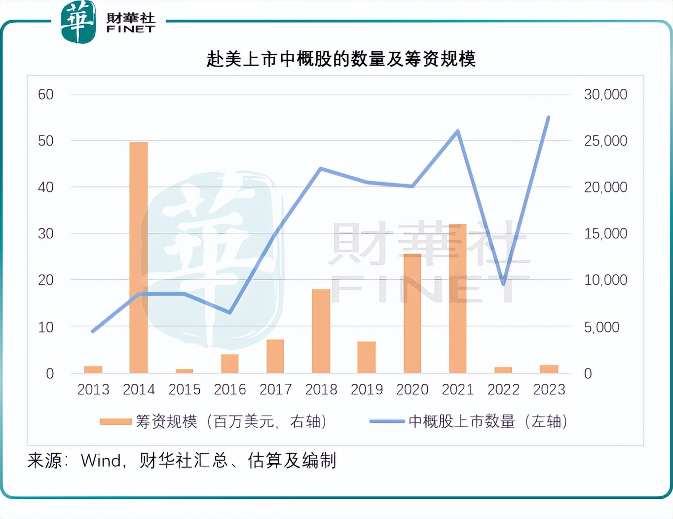 根据Wind数据统计,财华社对2013年至2023年中概股上市情况进行了分析。结果显示,2023年赴美上市中概股数量为55家,较去年的19家显著增加,创下自2013年以来的新高。同时,筹资规模也由去年的6.49亿美元回升至8.32亿美元。然而,与2020年和2021年甚至2014年阿里巴巴(BABA.US)与京东(JD.US)上市时的盛况相比,仍存在较大差距。