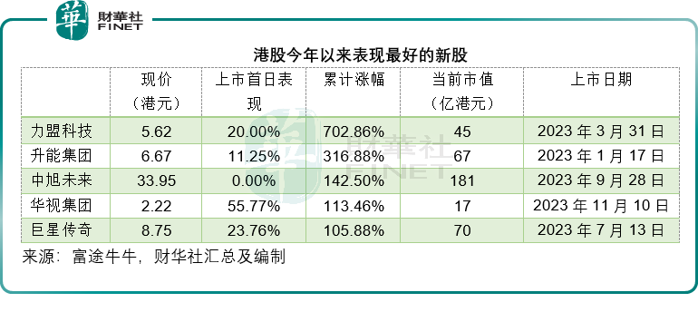 从累计涨幅来看,表现最好的是从事跨境数字营销服务的力盟科技(02405.HK),累计涨幅达7.03倍;第二是从事石墨电极生产的升能集团(02459.HK),累计涨幅3.17倍;第三是从事网络游戏发行的中旭未来(09890.HK),累计涨幅1.43倍;第四是前文提到的华视集团;连周杰伦概念股巨星传奇(06683.HK)也挤进了前五,累计涨幅达1.06倍,见下表。