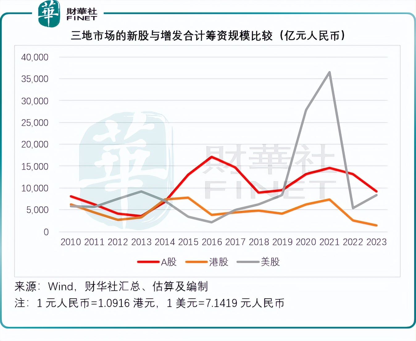 2023年A股总筹资额规模达到9,164亿元人民币,远高于美股的1,177亿美元,约合8,409亿元人民币,而港股市场的总融资规模仅相当于去年的一半。