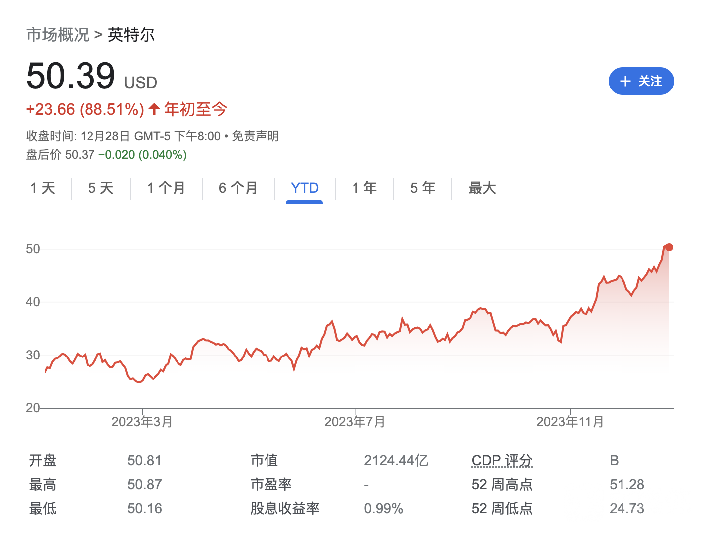 截至2023年12月29日美股收盘,英特尔(NASDAQ: INTC)股价报收50.25美元/股。