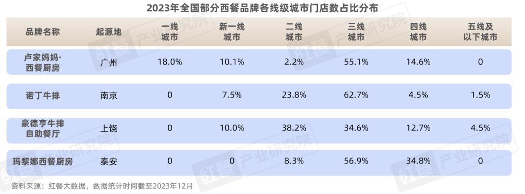 比如卢家妈妈·西餐厨房、诺丁牛排、豪德亨牛排自助餐厅、豪客来等知名连锁品牌都于下沉市场布局了大量的门店。红餐大数据显示,上述品牌均有超过五成的门店分布在三线及以下城市。