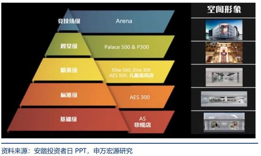 主品牌安踏也正在做类似的改变,用新任CEO徐阳的话来说就「将安踏越做越小」。主品牌安踏开始通过多层级的门店匹配客群需求。据徐阳透露,后续构建 Arena(竞技场级)、Palace(殿堂级)、Elite(精英级)、AES(标准级)、AS(非规店)等差异化的渠道结构,用不同形象匹配不同商圈和客群。