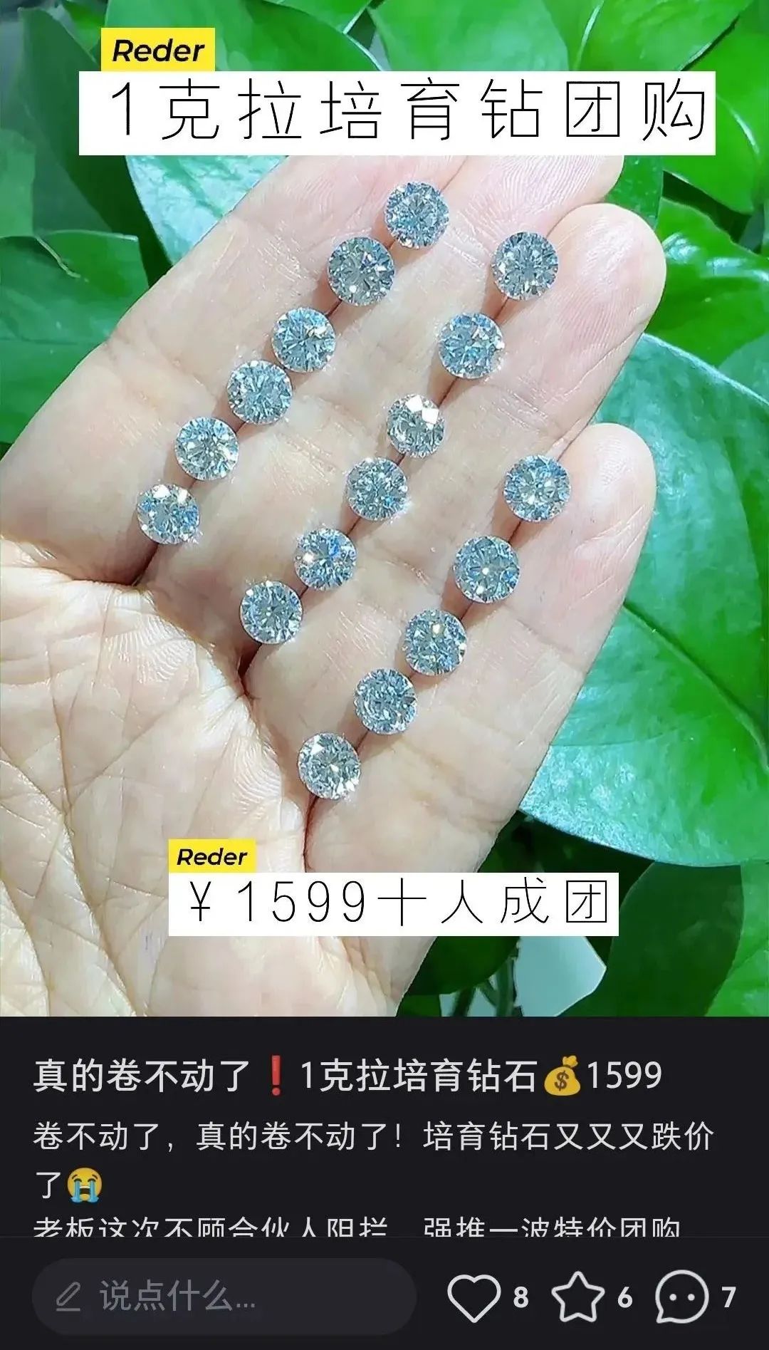郭思文的同行们中,甚至有人推出了1克拉Def si(成色等级高、有小杂质)等级培育钻“裸钻1599元一口价”的活动。