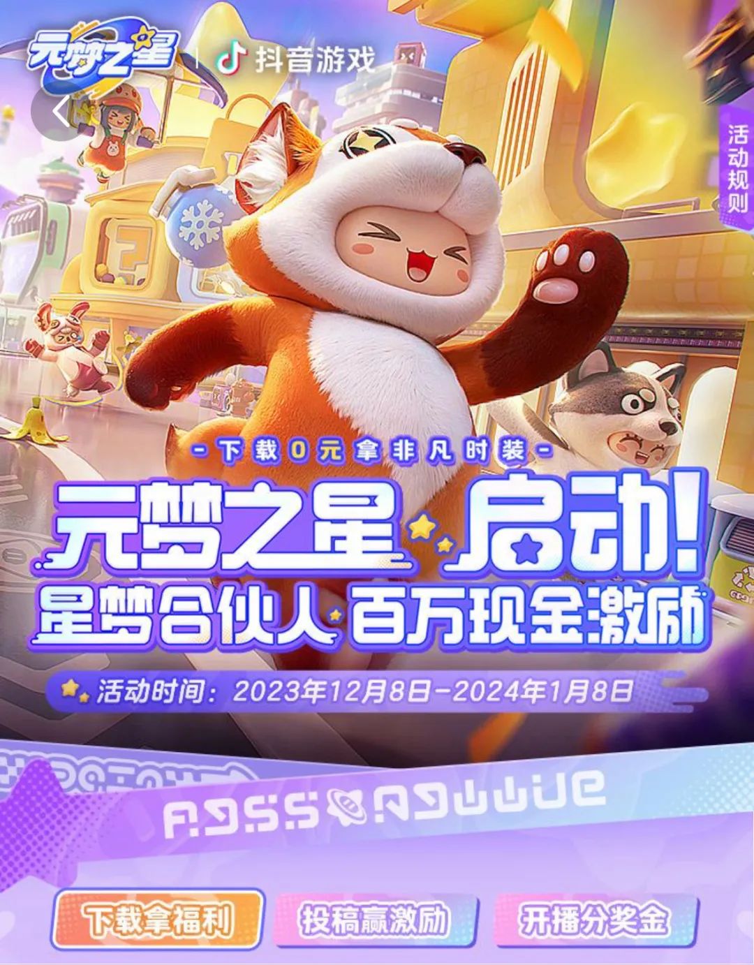 除了加入了抖音官方推出的游戏发行人计划,通过小手柄功能开放游戏下载入口,根据下载量为创作者分成外,《元梦之星》还在抖音开启了专场活动,包括但不限于赠送抽奖机会及时装等下载福利、投稿和直播瓜分现金激励等。
