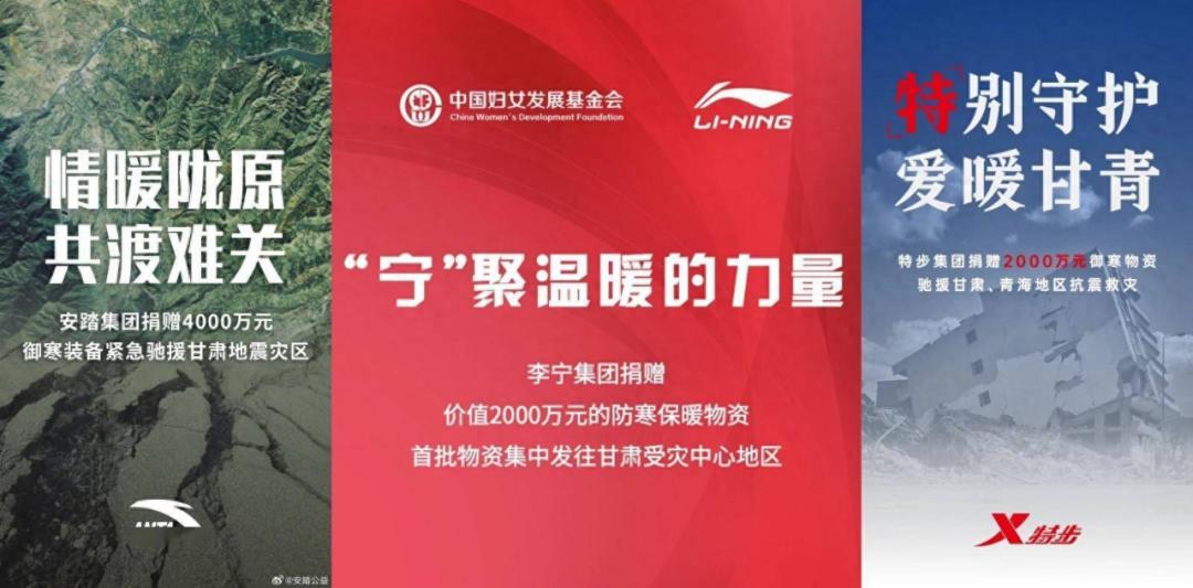 近日,多家体育用品企业宣布向甘肃地震灾区捐款、捐物资进行支援,其中安踏捐赠了价值4000万元御寒保暖装备,李宁、特步、鸿星尔克捐赠了价值2000万元的御寒物资,361°和匹克捐赠了价值1000万元的御寒物资。