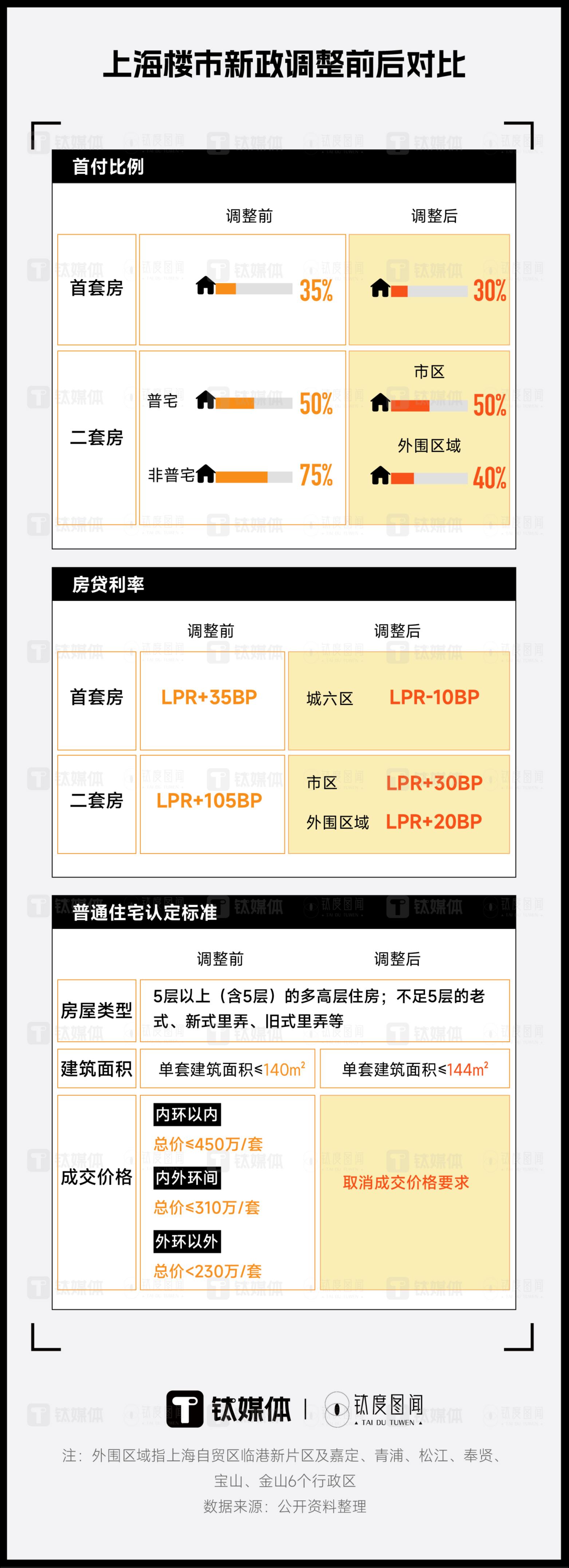 此外,上海首套房的首付比例也由35%下调至30%;在二套房的首付比例上,由此前根据普宅和非普宅标准划分改为6个行政区差异化标准,对自贸区临港新片区、嘉定、青浦、松江、奉贤、宝山、金山6个外围行政区实行更优惠的利率政策。