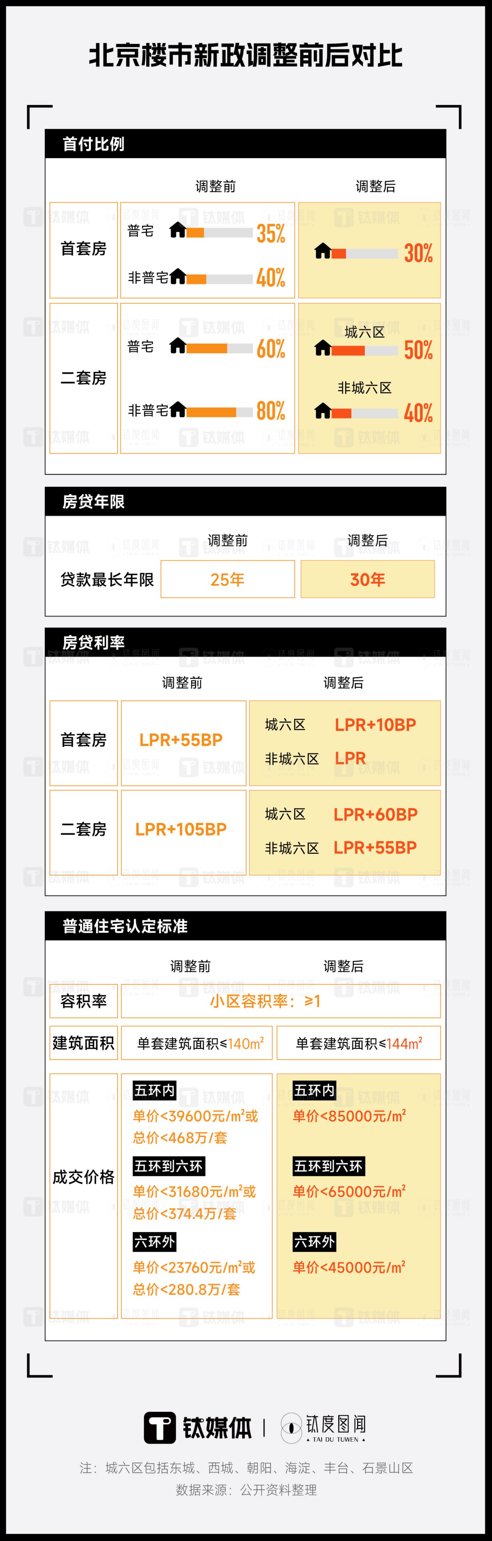 在新政出台之前,北京楼市区分首套房和二套房、普通住宅和非普通住宅的首付比例,此次新政取消普宅和非宅的标准划分,将首套房的首付比例一律下降至30%;二套房的首付则按照城六区和非城六区标准划分,分别为50%和40%;同时,贷款年限也由此前的25年延长至30年。此外,北京还降低了房贷利率,减轻购房者利息负担。在首套房方面,贷款利率最低为4.2%;在二套房方面,贷款利率最低为4.75%。