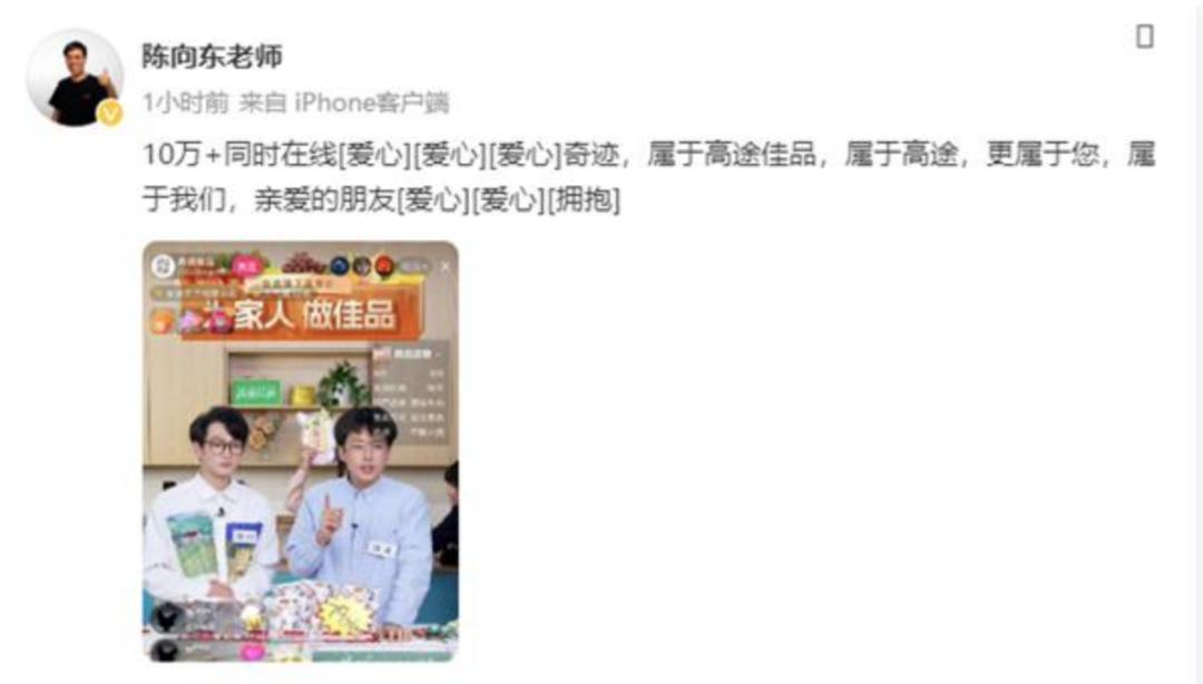 报道显示,12月14日上午,陈向东在微博发文提到,从12月11日开始,超多的粉丝涌进高途佳品直播间,其个人号“高途陈向东”也有超多的粉丝过来评论。高途佳品的粉丝量暴增,陈向东激动地在朋友圈说“10万+同时在线”。