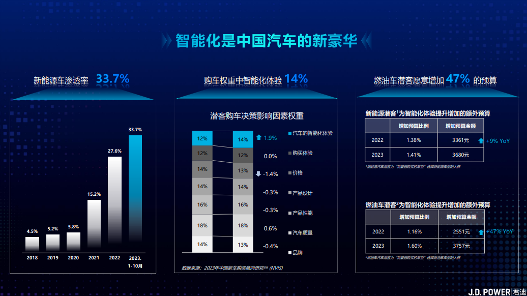 智能化的发展是随着新能源车崭露头角而来的,电动化是汽车变革的上半场。截至今年11月,新能源车在2023年新车市场的渗透率有望超过35%,在某些一线城市最近几个月,新能源车的渗透率甚至已经超过了50%。在这一大趋势下,逐渐进入了汽车变革的下半场智能化。在J.D. Power的2023年潜客研究中,我们发现未来六个月内有购车意向的消费者中,对智能化体验在购车决策中的权重逐年上升,从去年的12%增至今年的14%。与此对应,价格在购车过程中的权重略有下降。其次不论是首次购车还是置换的消费者,其人群结构也发生了变化,90后成为了主力人群,并即将过渡到95后。这一人群对车辆智能化有着较高的期望,愿意为智能化体验支付额外费用。
