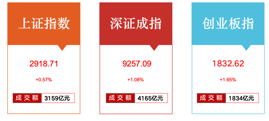 今日收盘,沪指报2918.71点,涨0.57%;深成指报9257.09点,涨1.08%;创业板指报1832.62点,涨1.65%。两市成交额7324亿元,较上一交易日放量688亿元,超3500只个股上涨。今日,北上资金净流入28.98亿元、净买入12.03亿元。