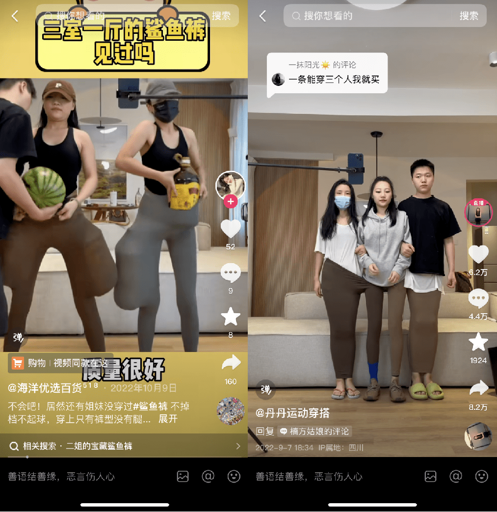 在鲨鱼裤品类的认知教育上,产业带商家也功不可没。早在一年前,“鲨鱼裤能装下三室一厅”的段子就曾在抖音上爆火。