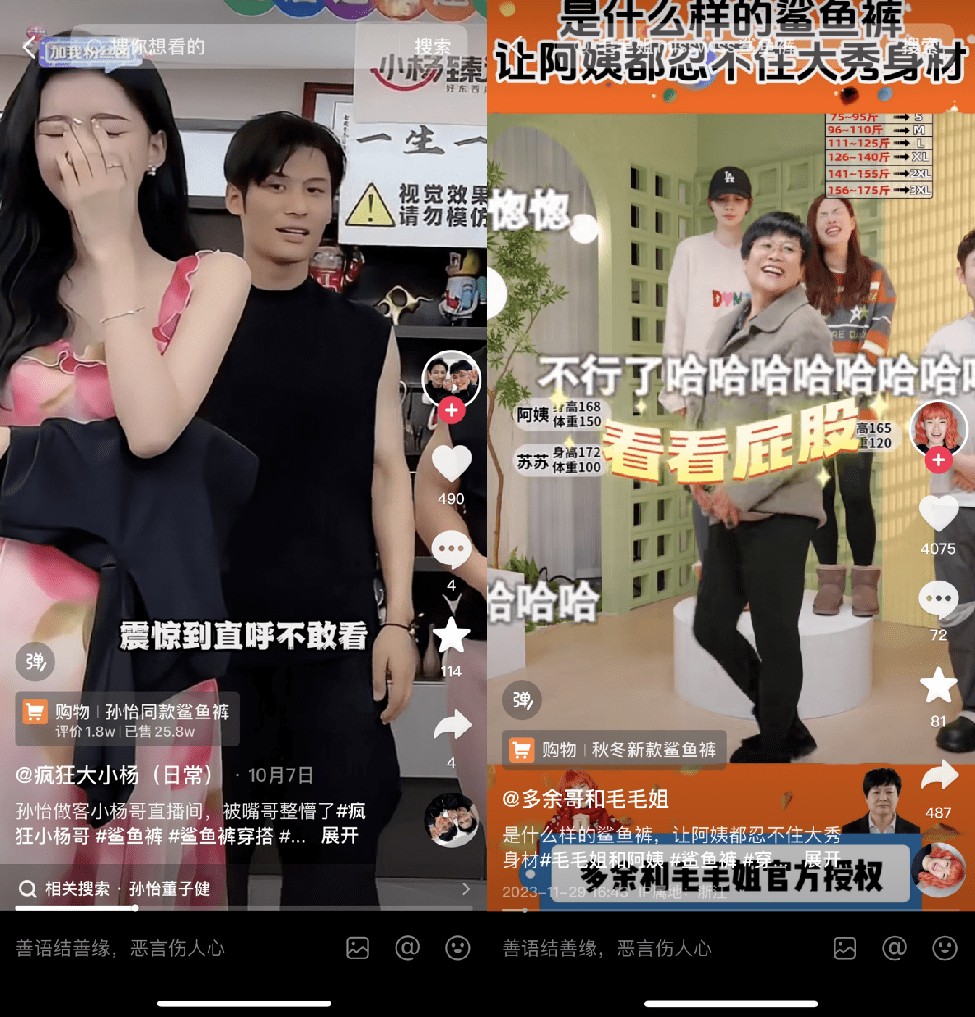 在多余和毛毛姐的直播间,有网友质疑SINSIN鲨鱼裤不好看,毛毛姐立刻找来“老阿姨”现场试穿,上身效果把购物氛围推向高潮。