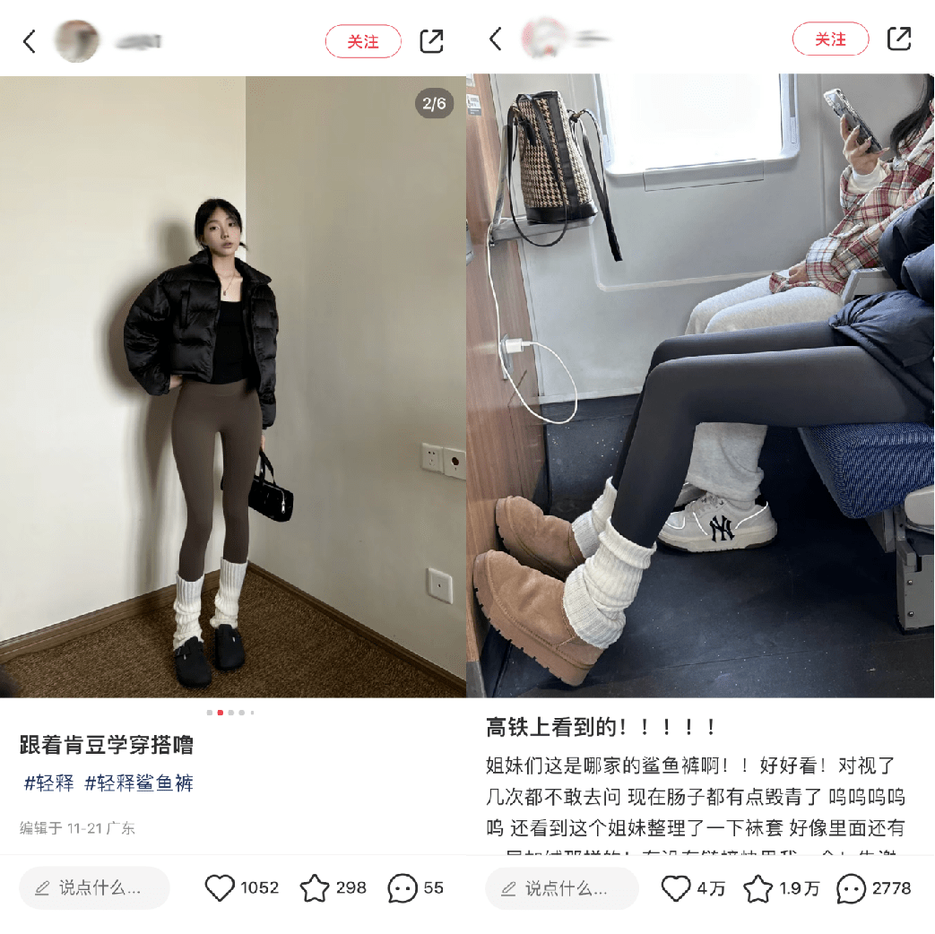 在小红书上搜索鲨鱼裤,弹出“鲨鱼裤穿搭”、“鲨鱼裤袜子推荐”、“鲨鱼裤搭配羽绒服”等词条。博主们的笔记里,最常见穿搭是一条修身鲨鱼裤+米白色袜套+老爹鞋或雪地靴,打造出一种保暖又时髦的athleisure(运动休闲)风格。