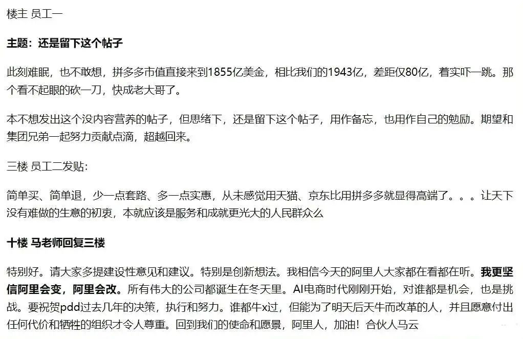 11月29日,当拼多多市值超过阿里巴巴的时候,朋友圈纷纷表示见证了中国电商行业的历史性时刻。阿里员工更是夜不能寐,在内网“直抒胸臆”,留下帖子用作自勉。阿里灵魂人物马云也对该事件及时做出了回复,表示阿里会变、阿里会改。