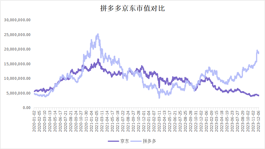 拼多多第一次市值长时间高于京东,是在2021年1月-7月,也是京东处于被动状态的开始。这个时段打败京东的,是拼多多由于新玩法所带来的低价。