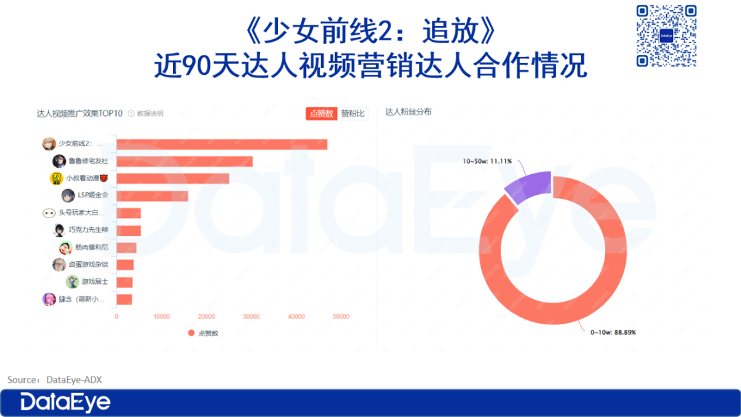 DataEye-ADX达人营销数据显示,《少女前线2:追放》早早开启了抖音效果型达人营销,合作的达人腰尾部达人为主,0-10w粉丝的尾部粉丝占比超过8成,10-50w粉丝的中腰部达人占比在1成左右。